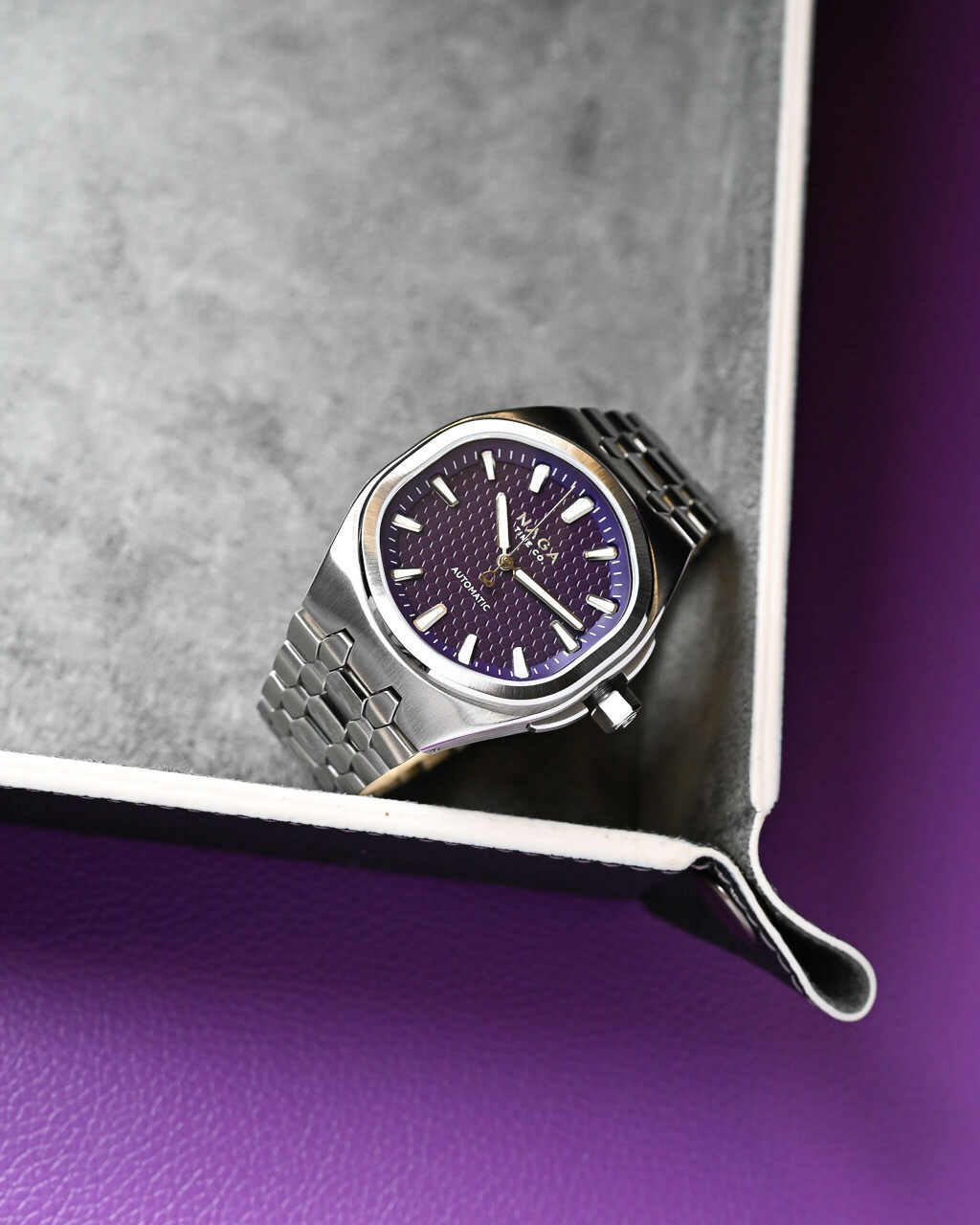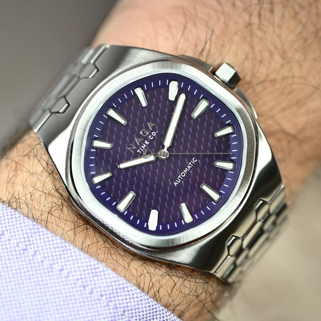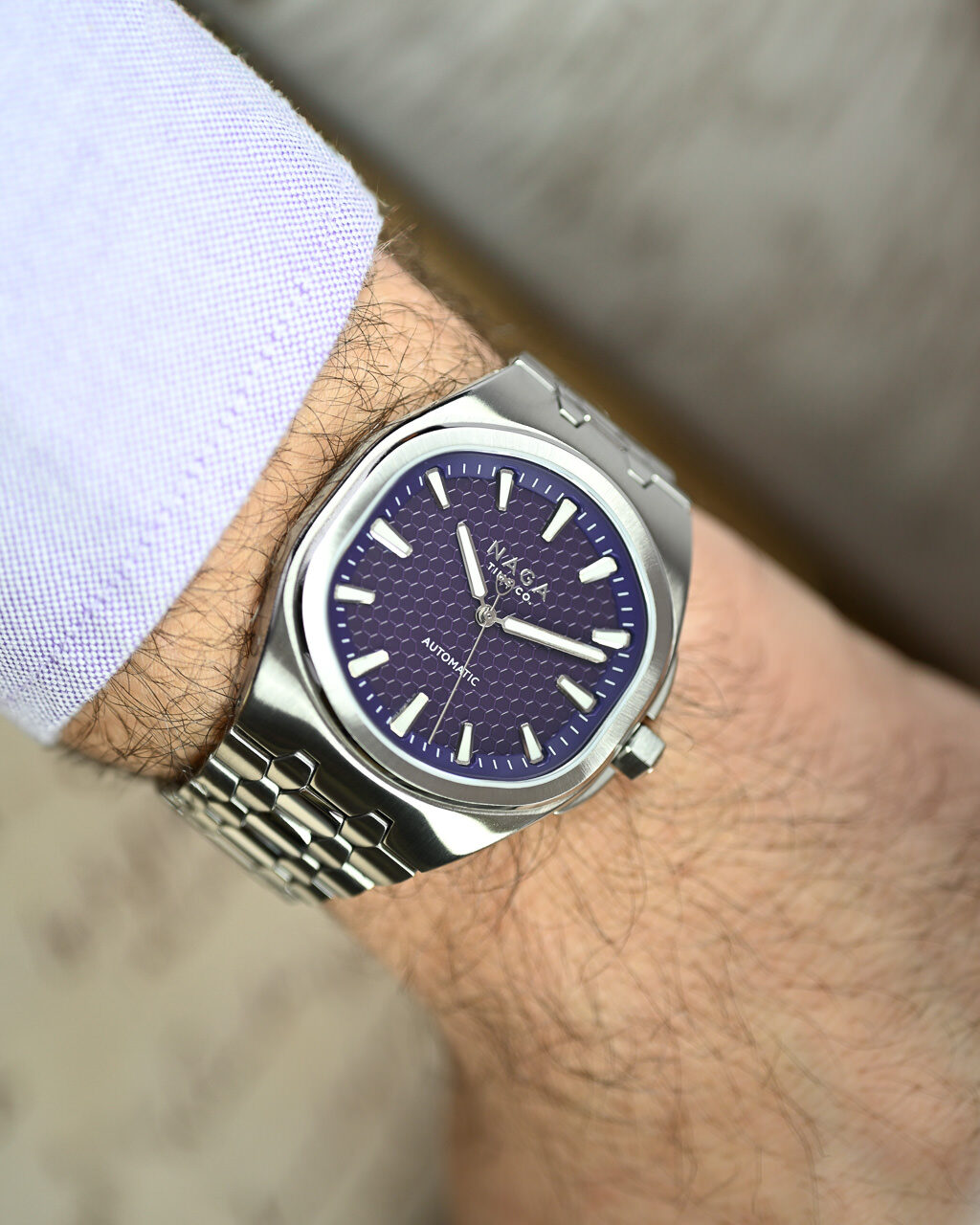 Ceas Naga Time Co. 39 Cosmic Purple Automatic ofera precizie si design rafinat. Cadranul sunburst blue si carcasa argintie ii confera eleganta. Perfect pentru purtare zilnica, colectie sau cadou sofisticat, acest diver watch premium combina durabilitate si stil pentru connaisseurs si pasionatii de ceasuri de calitate.